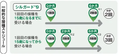 初回、2か月後、6か月後 (9歳以上15歳未満の女性は初回と6~12か月の2回も可) |