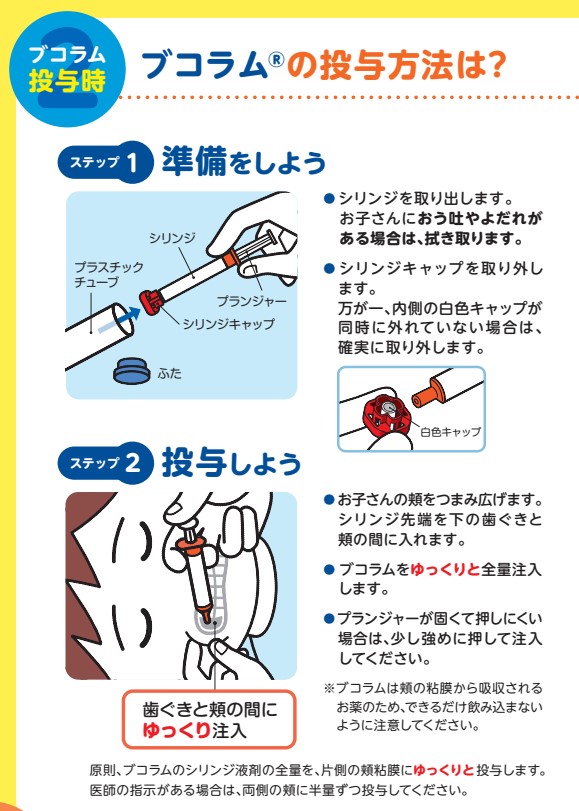- 本剤のシリンジ液剤の全量を片側の頬粘膜に緩徐に投与すること。体格の小さい患者や用量が多い場合は、必要に応じて両側の頬粘膜に半量ずつ投与すること。