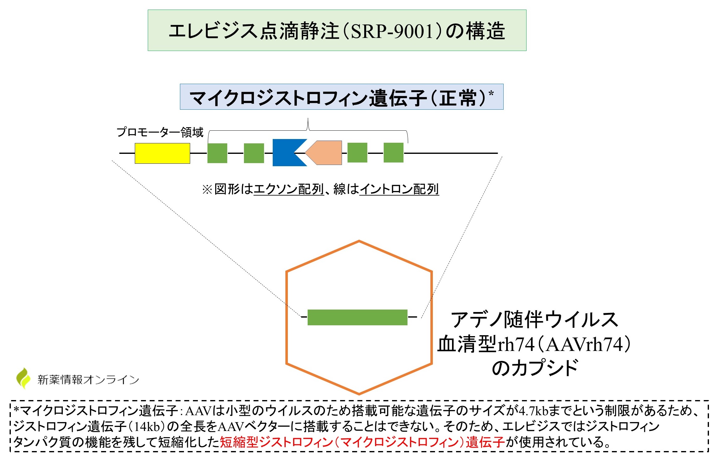 エレビジスの中身(構造)は、ジストロフィンタンパク質の機能を残して短縮化した短縮型ジストロフィン(マイクロジストロフィン)遺伝子を「アデノ随伴ウイルス血清型rh74(AAVrh74)」と呼ばれるウイルスの殻(カプシド)で包んだ構造をしています。
