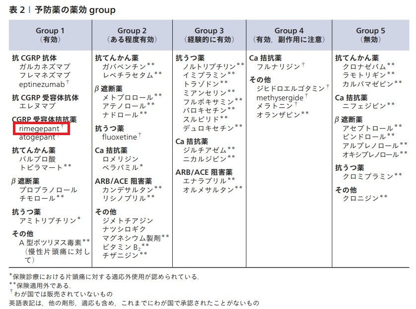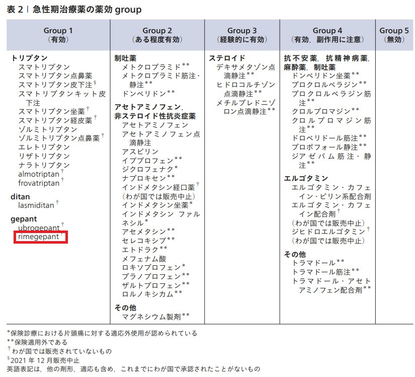 こちらもガイドライン1)において、ナルティークはCGRP関連抗体薬と同様のグループで推奨されています(ガイドライン掲載時は未承認)。