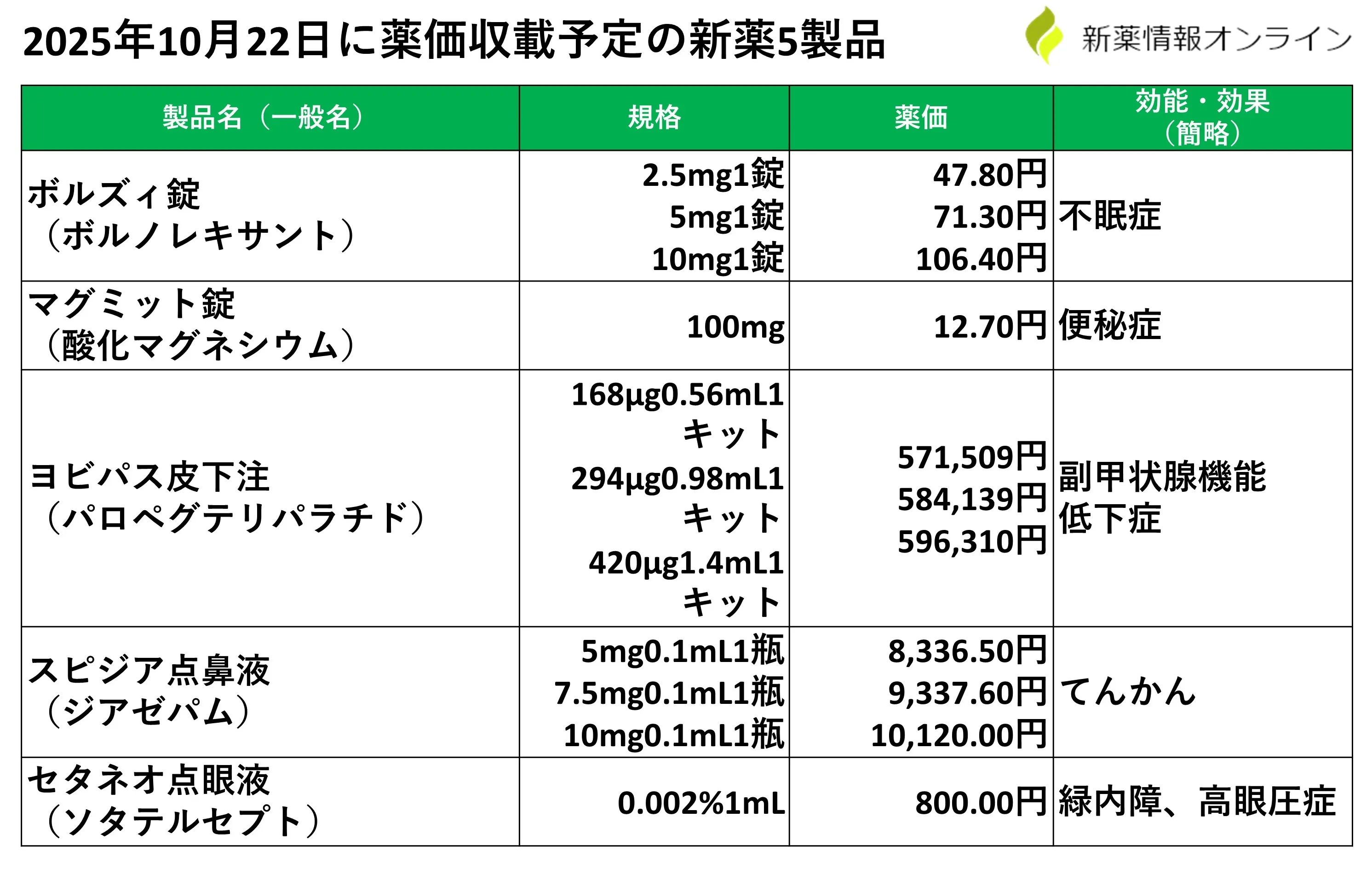 2025年10月22日、新薬5製品が薬価収載される予定です!