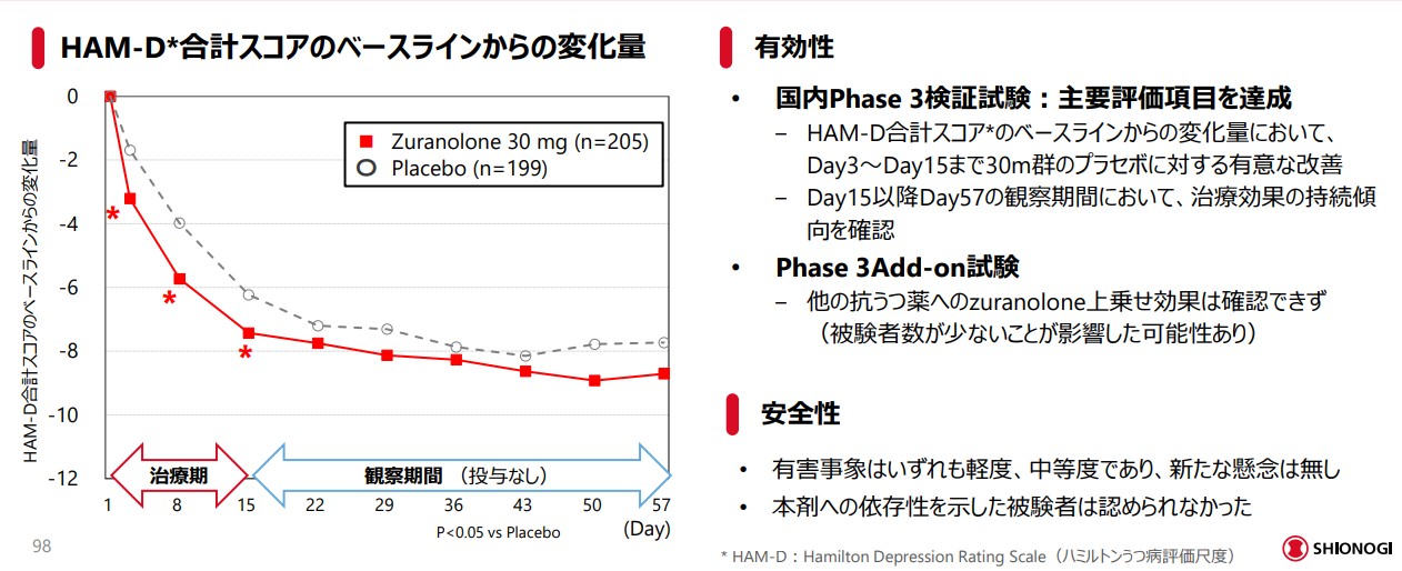 また、投与開始3日目においても、ザズベイ群でHAM-D合計スコアの有意な改善が認められていました。