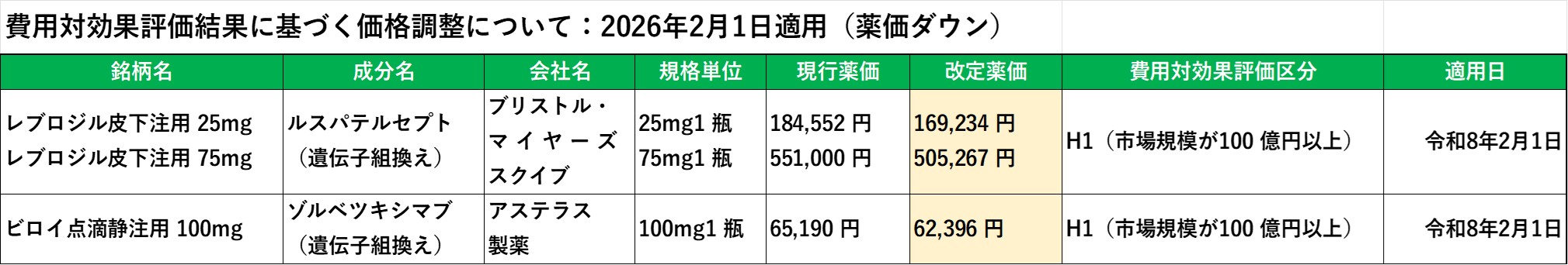 以上より、以下の通り、薬価が2026年2月1日からダウンします。