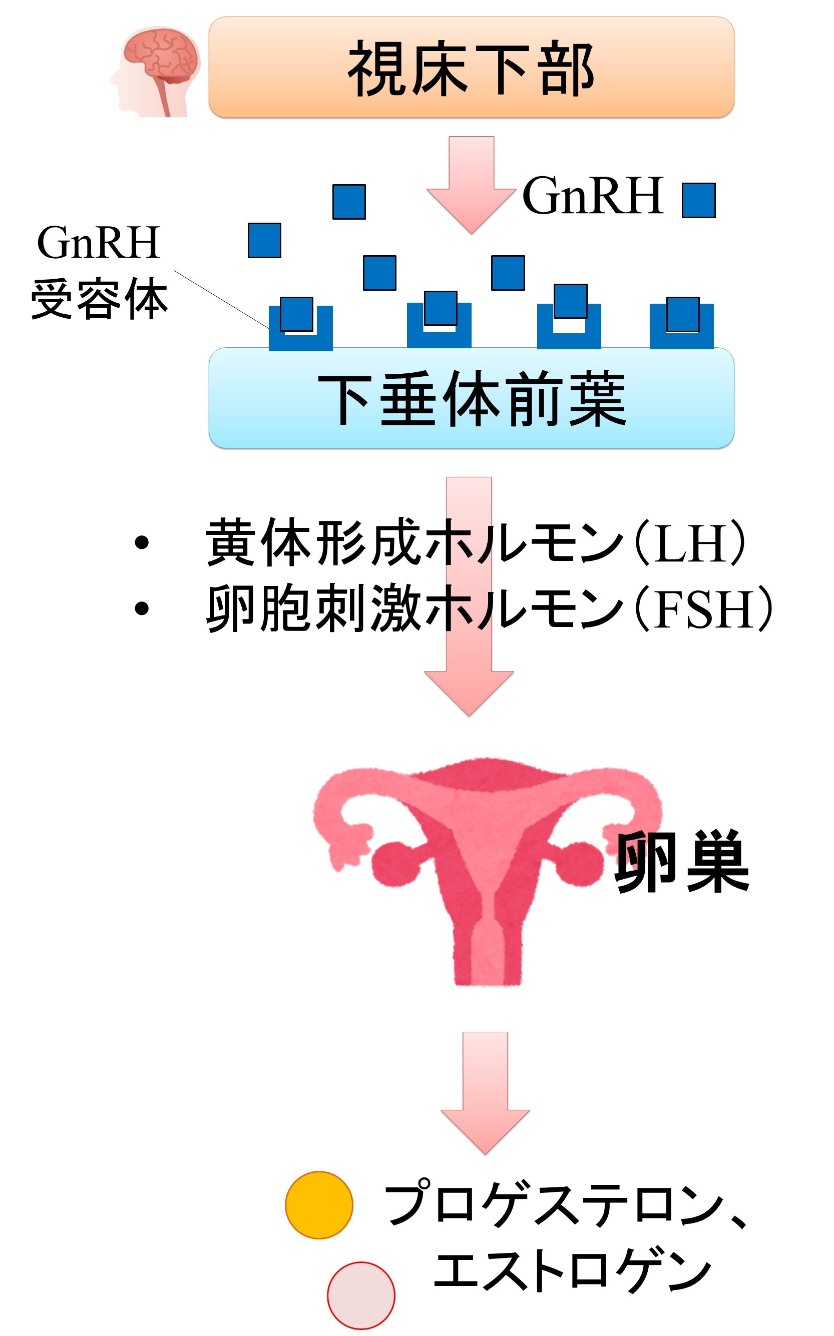 例えば、視床下部から分泌されるGnRH(ゴナドトロピン放出ホルモン)は下垂体前葉のGnRH受容体に作用し、LH(黄体形成ホルモン)とFSH(卵胞刺激ホルモン)の分泌を促進します。