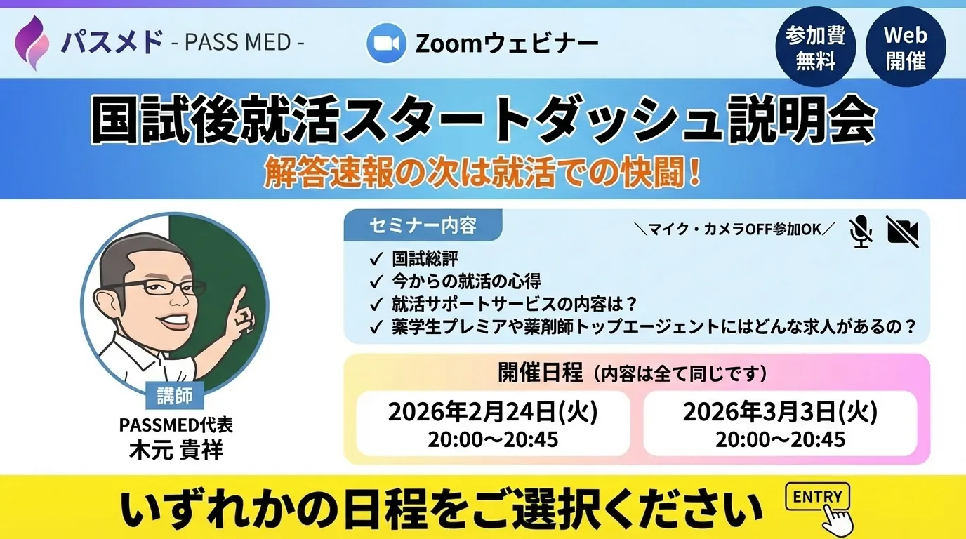 第111回薬剤師国家試験後には、総評(新薬出題、合格ボーダーライン予想)および国試後就活を成功させるためのオンライン説明会を開催します。就活が既に決まっている方でも参加可能です。参加は無料です。