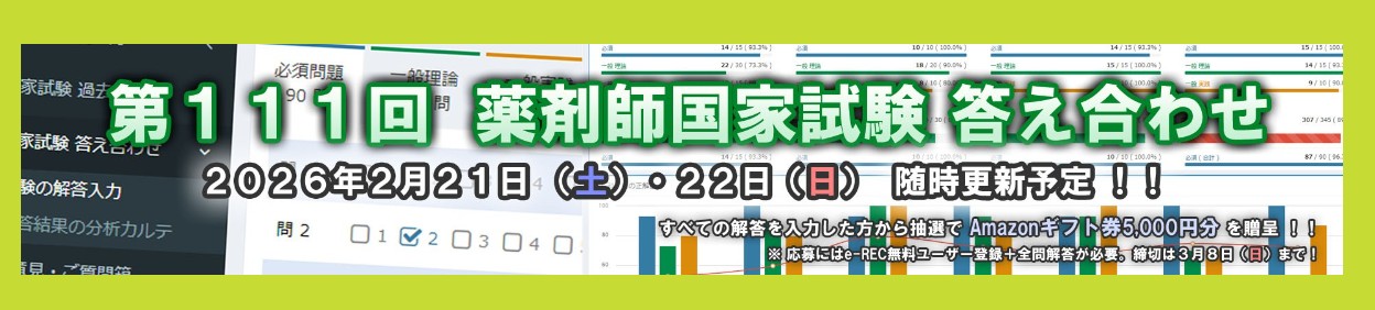 2026.2.22 15時半頃 メディセレに実践問題1の解答速報掲載、17時45分 薬ゼミとファーマプロダクトに実践問題1の解答速報掲載、18時 メディセレと薬ゼミとRECとファーマプロダクトに実践問題2掲載、21時30分頃 メディセレとRECに全ての解答速報が掲載、22時頃 ファーマプロダクトと薬ゼミも掲載