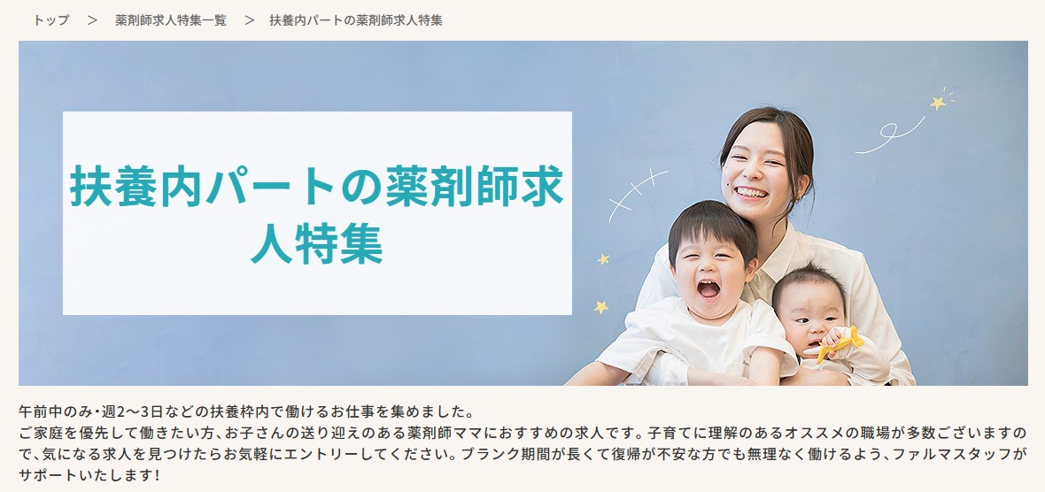 また、パート求人を探すのであればファルマスタッフが最適です。扶養内の働き方にも強く、求人数も圧倒的に多いため、あなたにピッタリの働き方が見つかりやすいと思います☆