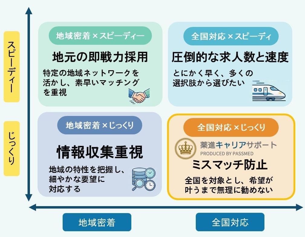 ①対応エリアは全国、②時間をかけた求人検索(オーダーメードでお探し)、③押し売りゼロの提案型